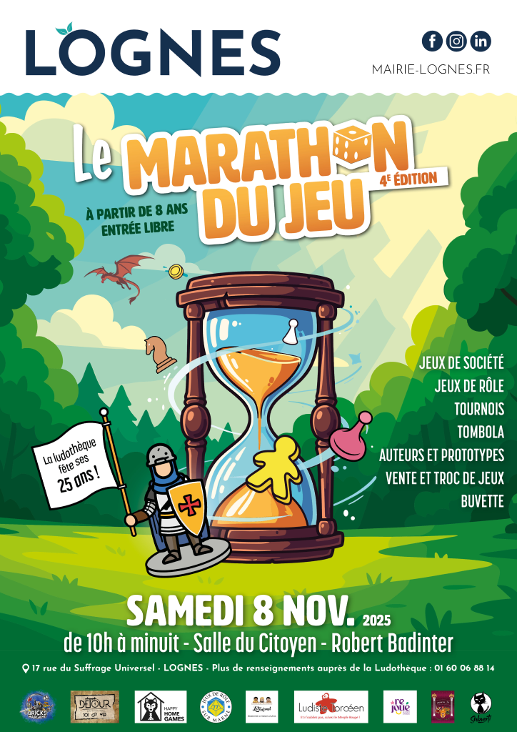 MARATHON DU JEU LE 08 NOVEMBRE 2025 A l'occasion du Marathon du jeu organisé par la Ludothèque de Lognes, nous organisons une série de parties d'initiation gratuites au JdR ouvertes à tous de 10h à minuit. Idéal si tu souhaites découvrir le JdR ou notre club avant d'y adhérer ☺️ Les places étant limitées, inscris-toi sans tarder ! |